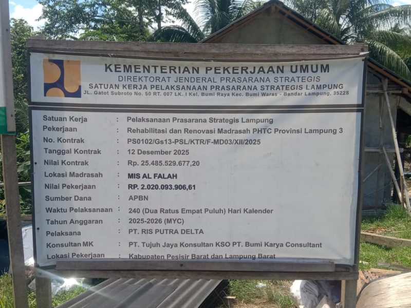 Berdasarkan data sistem pengadaan dari pemerintah provinsi melalui Kabupaten Pesisir Barat, proyek tersebut tercatat Pelaksana PT Ris Putra Delta. Paket pekerjaan itu berada di bawah satuan kerja Dinas Pekerjaan Umum dan Penataan Ruang (Dinas PUPR) Provinsi Lampung dan anggaran bersumber dari APBN Tahun Anggaran 2025 – 2026.