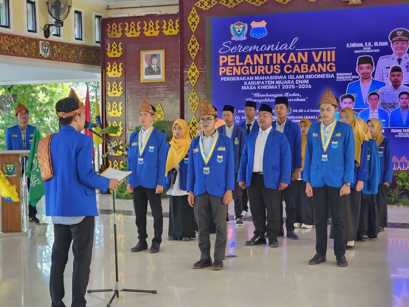 UNGKAPPOST, Muara Enim – Resepsi Pelantikan VIII Pengurus Cabang Pergerakan Mahasiswa Islam Indonesia (PMII) Kabupaten Muara Enim masa khidmat 2025–2026 berlangsung khidmat di Balai Agung Serasan Sekundang (BASS)Kabupaten Muara Enim, Jumat (31/10/2025).