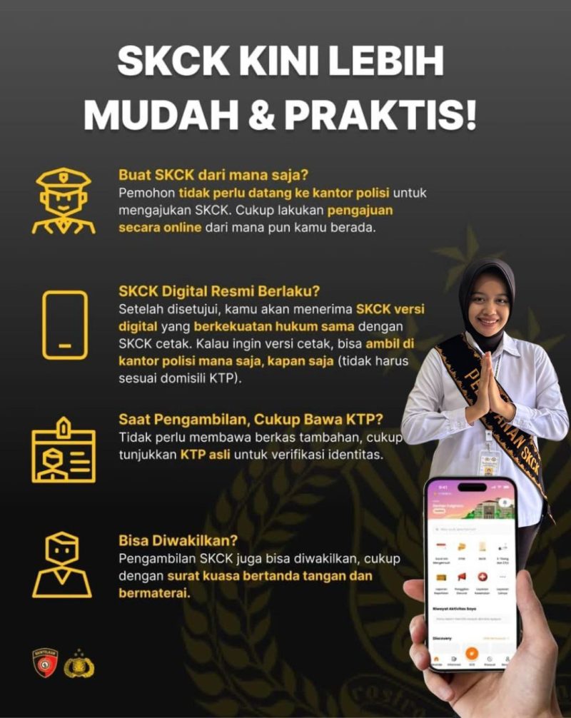 Proses pembuatan SKCK kini telah terintegrasi sepenuhnya melalui aplikasi yang dapat diunduh di Play Store (Android) dan App Store (iOS). Berikut tahapan pengajuannya: